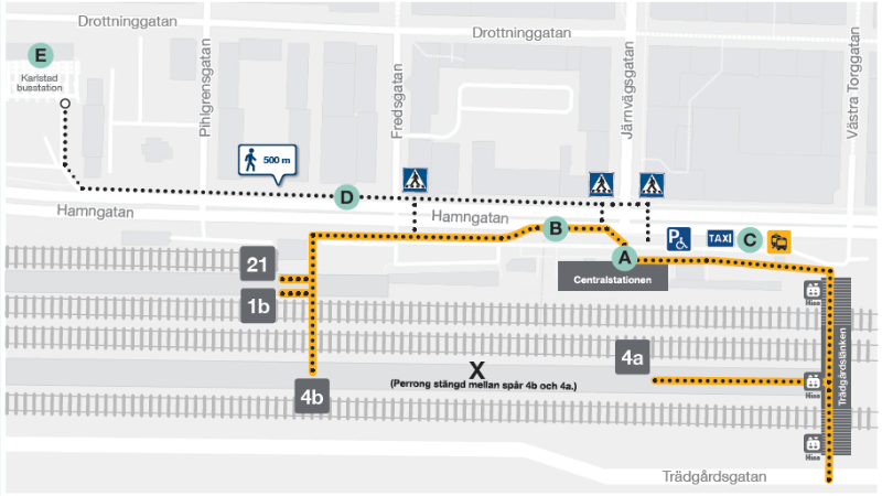 Så tar du dig till spåren på Karlstad CentralstationMedan Karlstads resecentrum byggs ändras gångvägarna till tågen vid flera tillfällen. Här hittar du kartor och mer information.