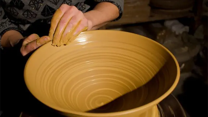 Arbetar med ett drejat stengods till privata hem och offentliga rum. Småskålar, vaser, fat, kannor till jättestora fat och relief.