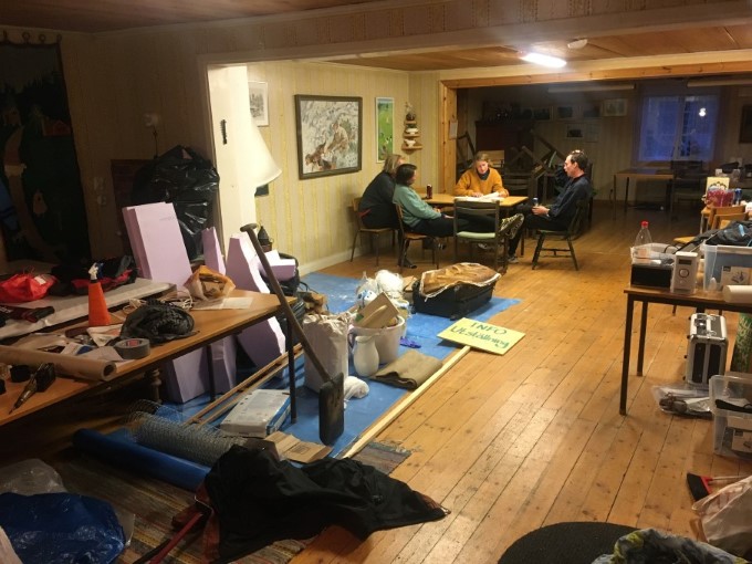 Planering, sen kväll i storstugan. Therése Olsson och Marcus Sjögren med hjälpredor. Foto Sabina Ostermark.