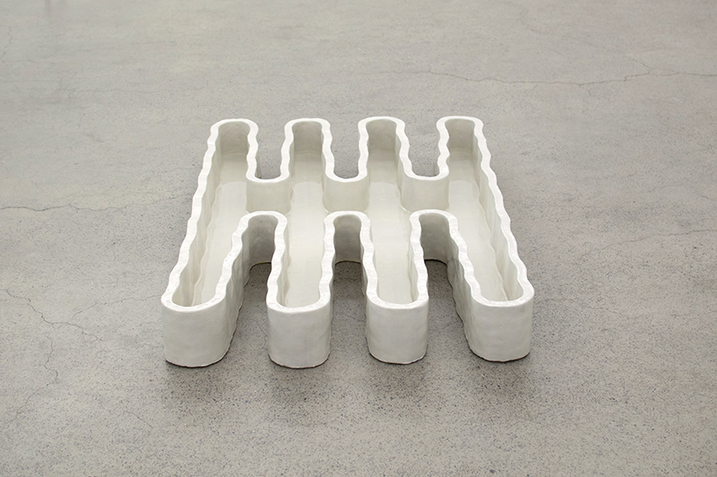 "Slipping through my fingers" (2022) är ett av Julia K. Perssons verk. Stengods, engobe, glasyr och vatten.