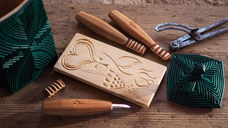 Med endast några få hållpunkter skär du mönstret med kniven steg för steg vilket ger ett livfullt uttryck. Du lär dig också om hur passaren används för att bygga upp urgamla geometriska mönster. Med denna enkla metod kan du bygga upp avancerade mönster utan vare sig bildhuggeriverktyg eller hyvelbänk.