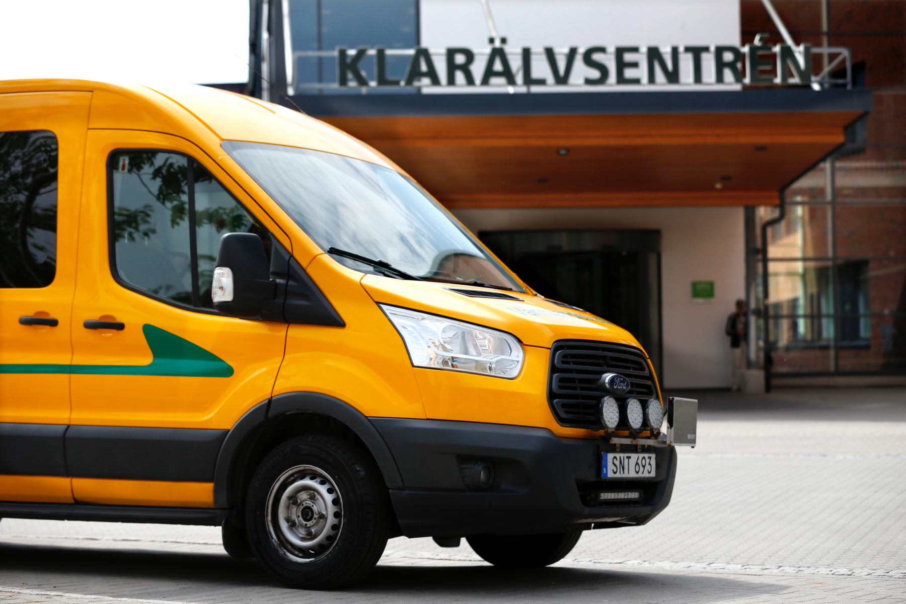 Gult servicetrafikfordon framför Klarälvsentrén på Centralsjukhuset i Karlstad