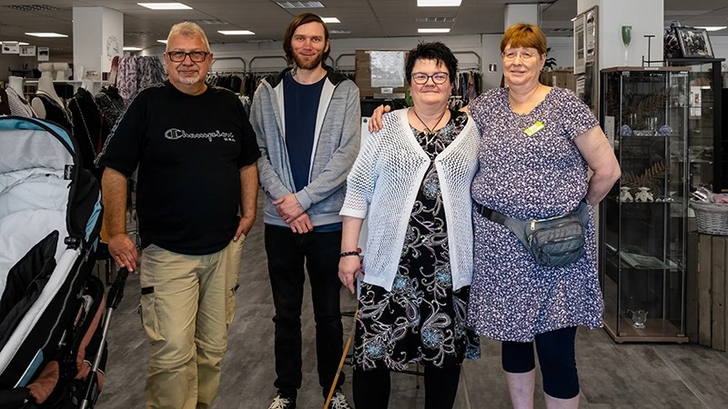 Det är en solig fredagseftermiddag när vi träffar de fyra kooperatörerna i en av deras verksamheter, secondhandbutiken i Charlottenberg. Gun, Bosse, Patrik och Karin har samlats i cafédelen. Än har de inte smält att de är årets vinnare av folkhälsopriset.