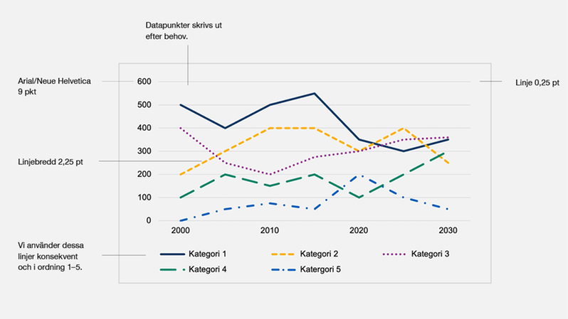 - Vi rekommenderar ej fler än fem kategorier per linjediagram.