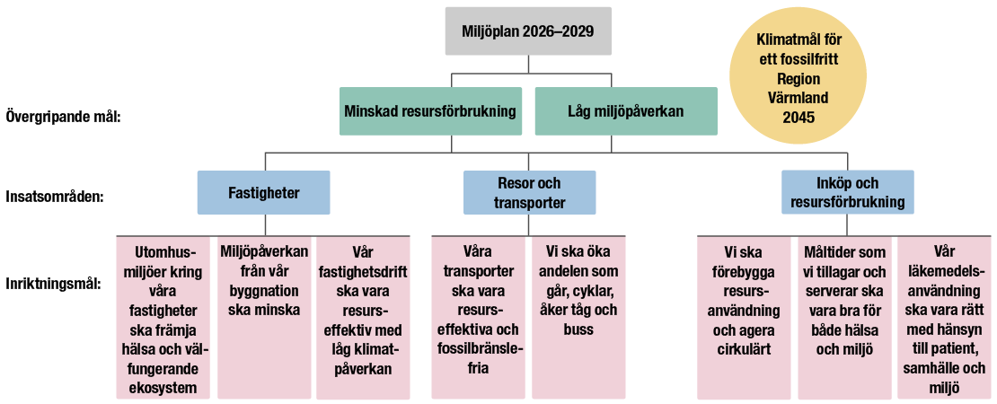 Två övergripande mål, tre insatsområden och åtta inriktningsmål har tagits fram i bred samverkan med verksamheterna och därefter förankrats med förtroendevalda inom Region Värmland. Till varje inriktningsmål finns detaljerade mål som ska uppnås senast 2029 om inget annat anges. Kopplingen till de nationella miljökvalitetsmålen och de globala målen i Agenda 2030 redovisas för varje inriktningsmål.