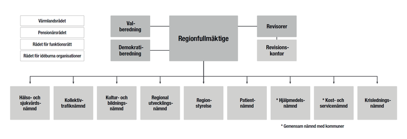 Region Värmland har nio nämnder. Två av nämnderna, hjälpmedelsnämnden och kost- och servicenämnden, styrs gemensamt med vissa av länets kommuner. En nämnd, krisledningsnämnden, träder i kraft enbart vid extraordinära händelser.