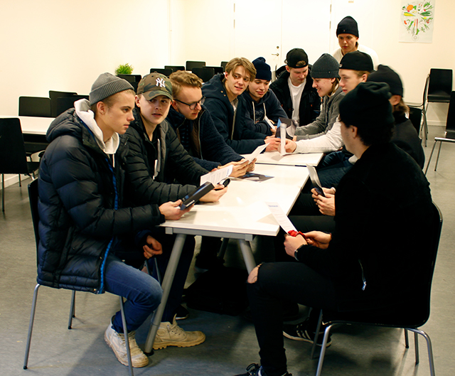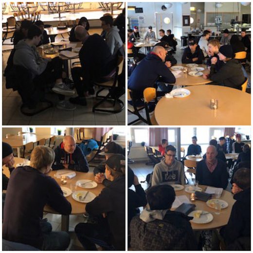 Vi var tre vuxna och18 elever som samlades i matsalen och år frukost och diskuterade. Till en början var det lite "stelt", men vi blandade frågeställningar ur kortleken med egna funderingar och till slut var alla bra med och villiga att diskutera. Någon fråga om porr mötes mest mest lite fniss och mummel medan sådant som handlade om bilden av manlighet/mansrollen ledde till mer utvecklande resonemang. Vi var inte överens i gruppen hela tiden, men tror alla kände att det var ganska prestigelöst. Vi tror det skulle vara bra att följa upp den här träffen med en två-tre lite kortare träffar under vårterminen för att bygga vidare på detta. Vi har ju redan skapat lite "nätverk" och relationer, något som jag tror vi får igen vid nästa träff. Då kunde man gå in lite djupare i diskussionerna.