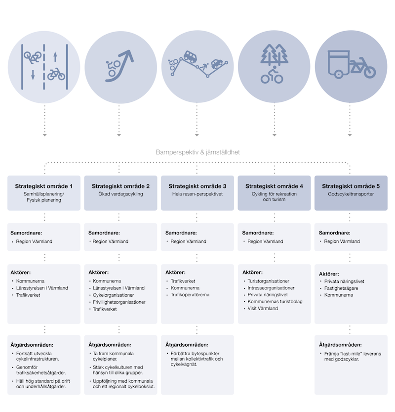 - Jämlikhet och inkludering för sammanhållning. Eftersom cykling är ett relativt billigt transportmedel är det tillgängligt för många. Region Värmland vill att fler ska lära sig cykla och ges möjlighet att nyttja cykelinfrastrukturen oavsett vilka förutsättningar de har. Det är viktigt att säkerställa att alla människor har säkra och gynnsamma miljöer och möjligheter att vara fysiskt aktiva i vardagen, oavsett ålder och förutsättningar.