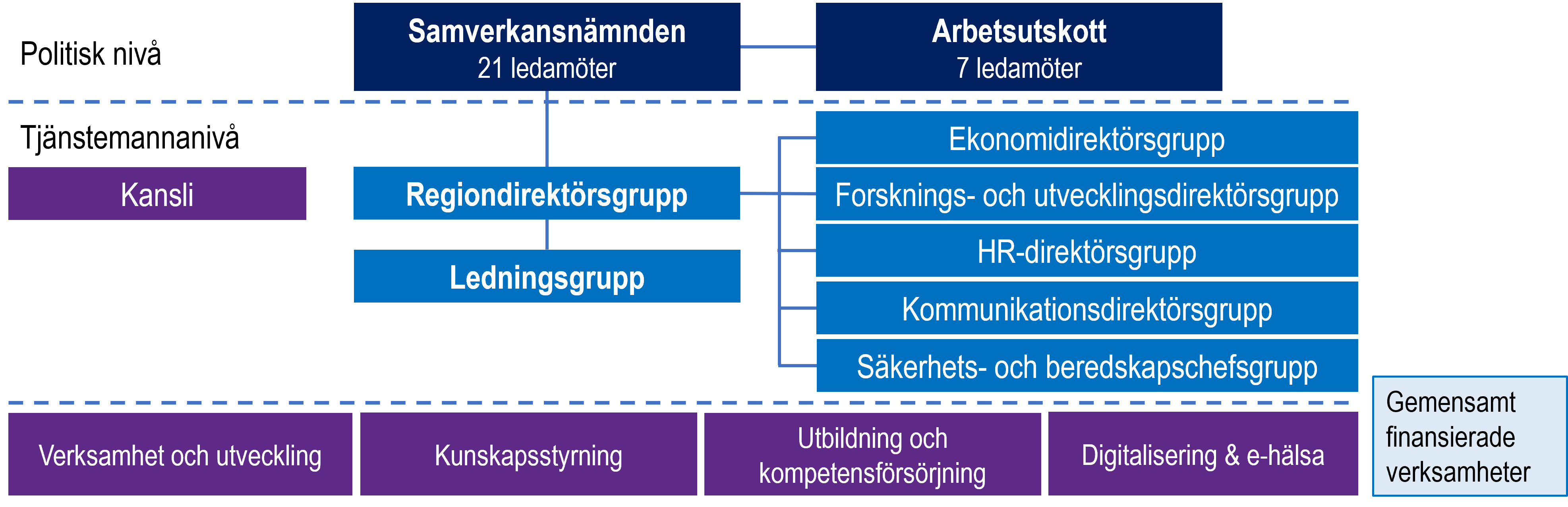 Här kan du läsa om hur samverkan mellan regionerna är organiserad, på politisk nivå genom samverkansnämnden och på tjänstemannanivå genom direktörsgrupper och samverkansnämndens kansli.