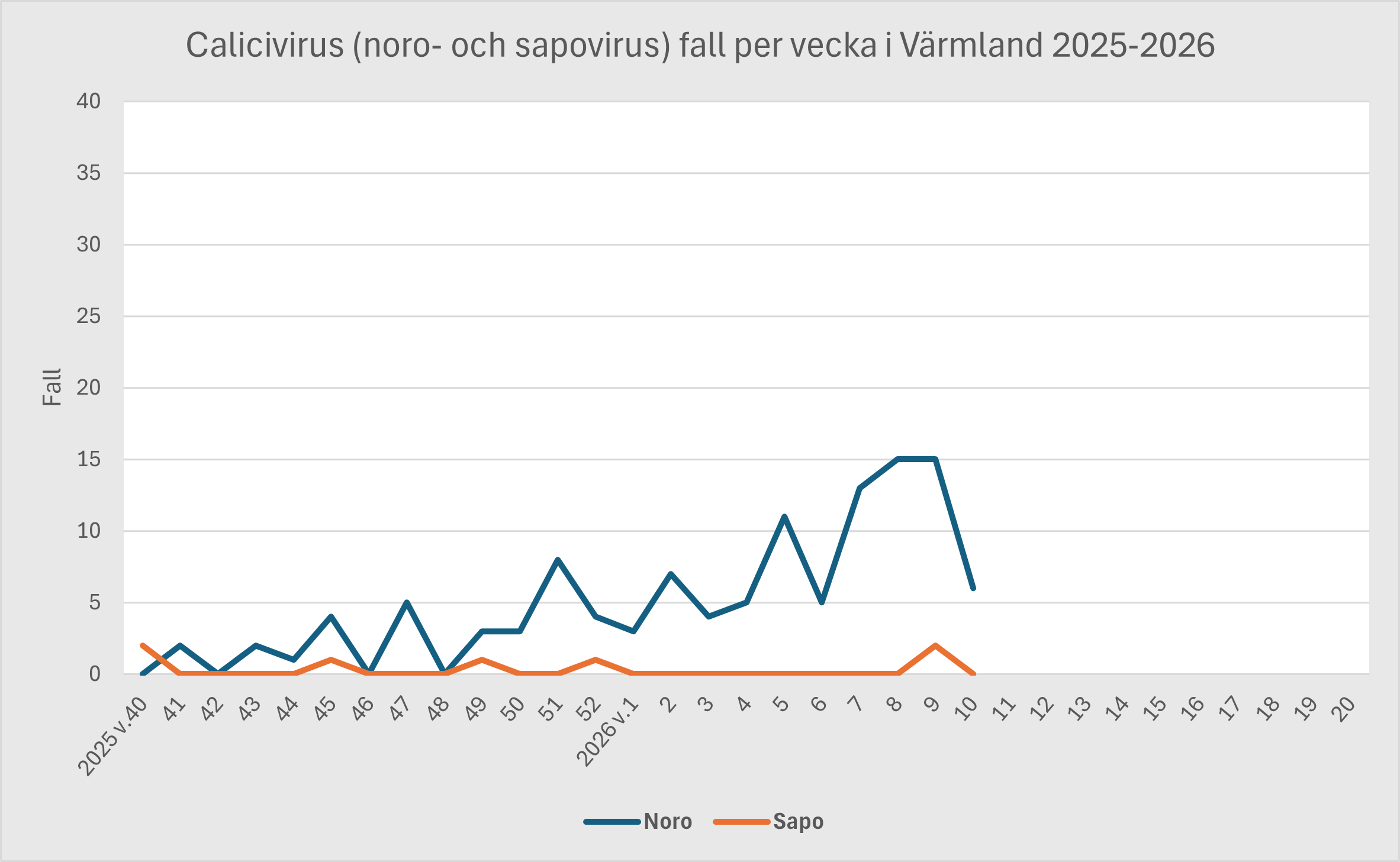 Antal fall av calicivirus (noro- och sapovirus) i Region Värmland per vecka under säsongen 2022-2023, 2023-2024, 2024-2025 och 2025-2026.