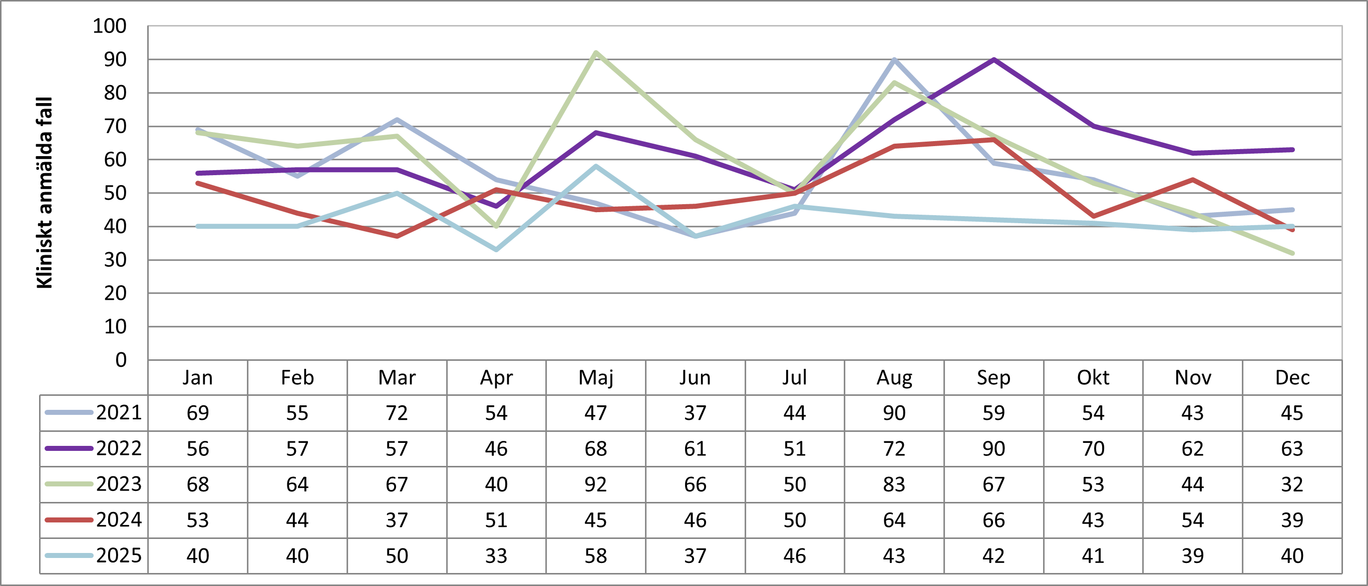 Antal fall av klamydia i Värmland per månad 2021-2025