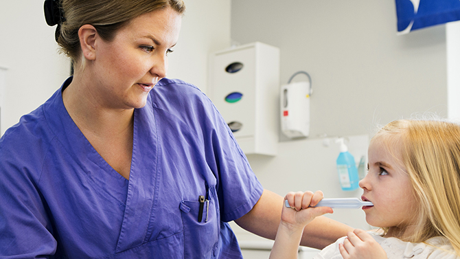 Vänj ditt barn vid att du borstar morgon och kväll. Ju tidigare borstningen blir en vana, desto friskare blir tänderna längre upp i åldern.