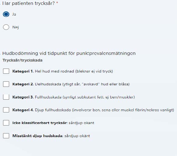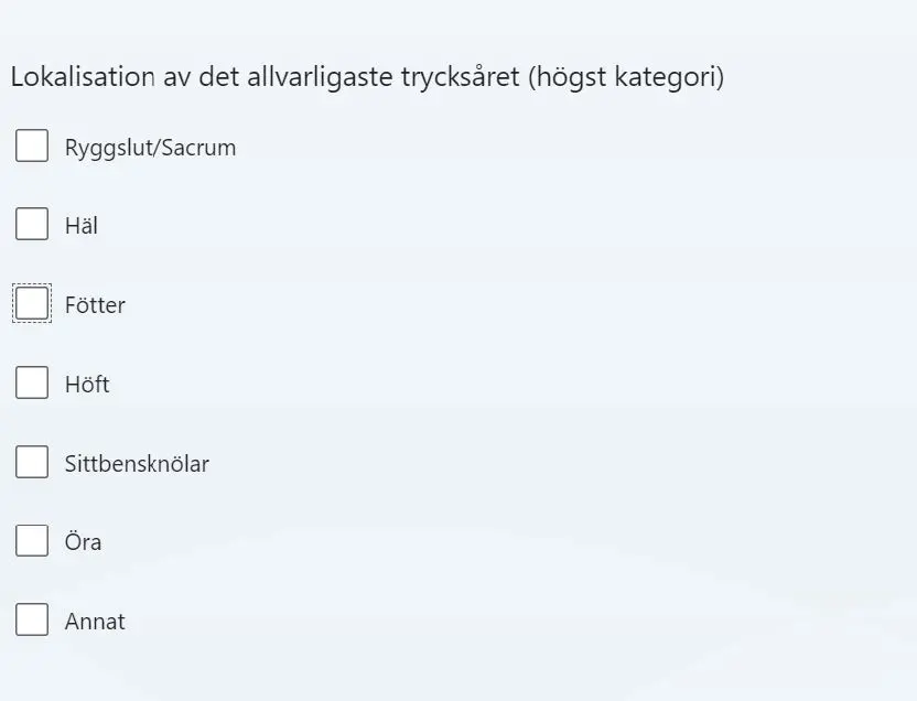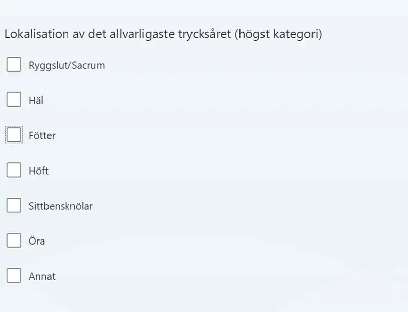 • Om patienten har trycksår, registrera vilken kategori såret tillhör (om patienten har fler än ett sår, välj flera alternativ).