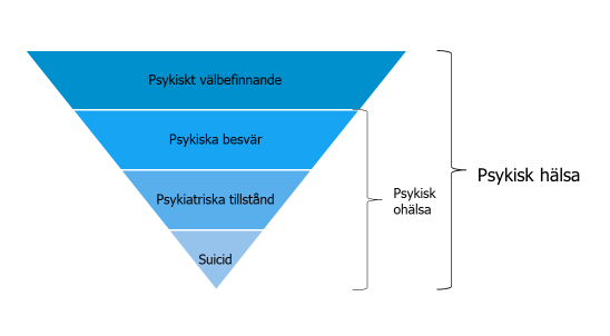 Psykisk hälsa och psykisk ohälsa är två samlingsbegrepp. De illustreras i bilden nedan och innefattar alla aspekter inom psykisk hälsa, både psykiskt välbefinnande och olika former av psykisk ohälsa. I psykisk ohälsa ingår psykiska besvär, psykiatriska tillstånd och suicid.