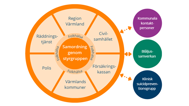 I Regionala nätverket för suicidprevention i Värmland deltar Region Värmland, länets alla 16 kommuner och flera andra organisationer. Styrgruppen samordnar arbetet i regionala nätverket. De övriga tre grupperna som är knutna till nätverket är Kommunala kontaktpersoner, Blåljussamverkan och Klinisk suicidpreventionsgrupp.