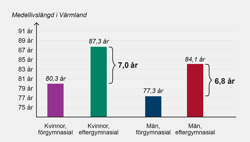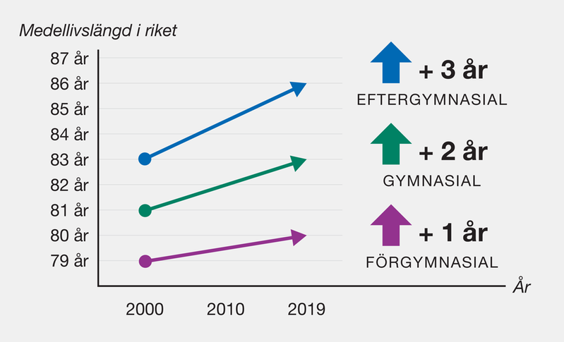 Grupper med hög utbildning har högst medellivslängd. Skillnaden mellan de olika grupperna har ökat de senaste 10 åren. Mellan år 2000 och 2019 ökade medellivslängden för grupper med förgymnasial utbildning med 1 år, för grupper med gymnasial utbildning med 2 år och för grupper med eftergymnasial utbildning ökade medellivslängden med 3 år. Källa: SCB.