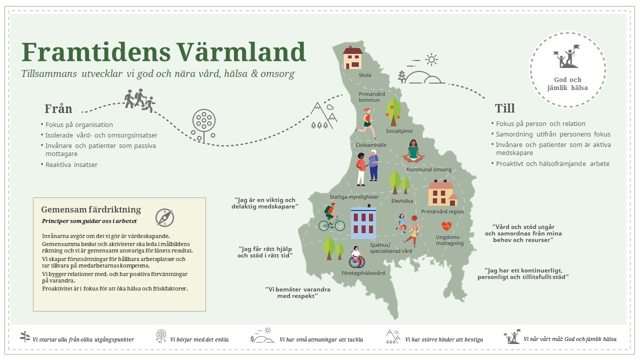 Länets 16 kommuner och Region Värmland har tillsammans tagit fram en målbild för omställningen. Arbete har skett i dialog med medarbetare, chefer, ledare, politiker och värmlänningar. Hela Värmland står enat i att arbeta i målbildens riktning.