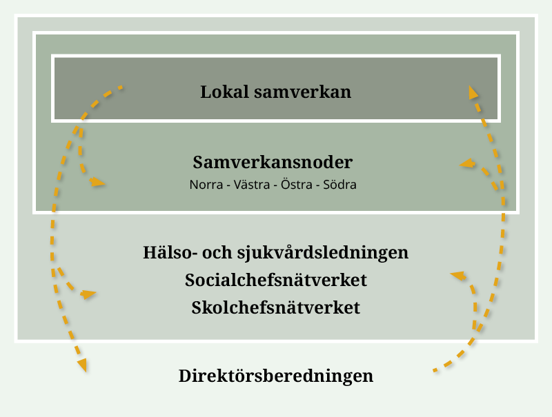 Regionens hälso- och sjukvårdsledning, kommunens skol- och socialchefer samt länets direktörsberedning har ett gemensamt ansvar för att vara systemledning för arbetet mot en god och nära vård, hälsa och omsorg. Uppdraget är att styra, leda och driva omställningen.