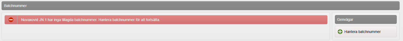 Lägg till batch genom att klicka på Hantera batchnummer under Genvägar i vaccinationsflödet. I vyn Hantera batchnummer väljer du aktuell batch i listan från Läkemedelsverket, ange antal och kontrollera att utgångsdatum stämmer.