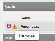 En varningstriangel, som med hjälp av tooltip beskriver att patienten var i riskgrupp när vaccinet gavs, visas i MittVaccin om man svarat ja på frågan.