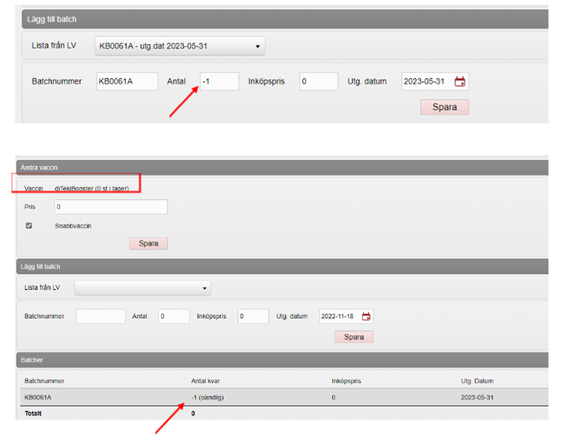 Om din enhet inte vill hålla lagersaldo uppdaterat med exakta doser av respektive vaccin så finns en möjlighet att förenkla detta handhavande. I stället för att lägga till korrekt antal doser när du lägger till en batch av ett visst vaccin så kan du skriva -1. Det kommer resultera i ett oändligt saldo av just den batchen.