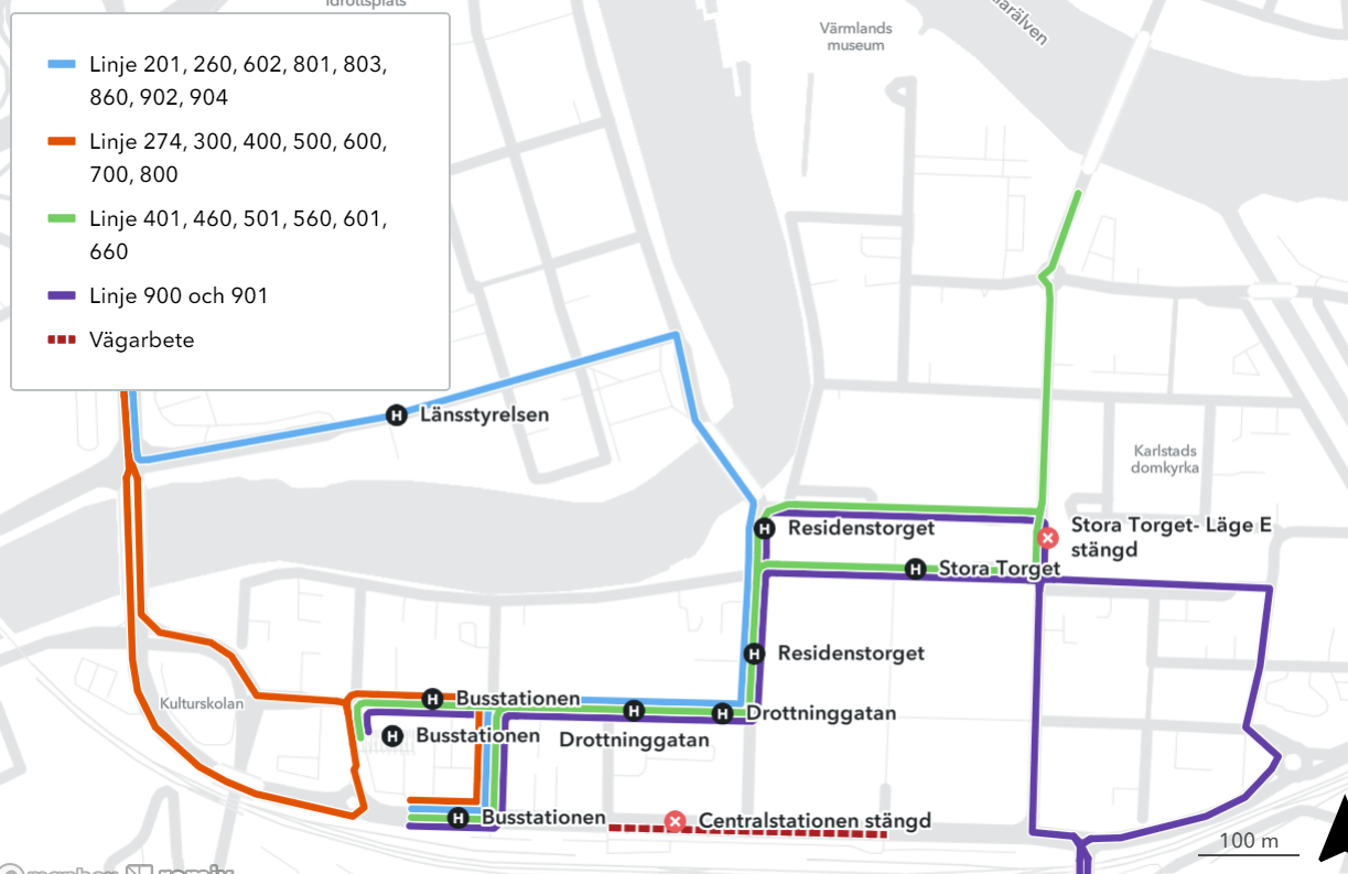 Hållplats Stora torget läge E och Centralstationen är stängda och linjerna trafikerar hållplatserna Busstationen, Drottninggatan och Residenstorget på sin väg ut och in genom Karlstad.