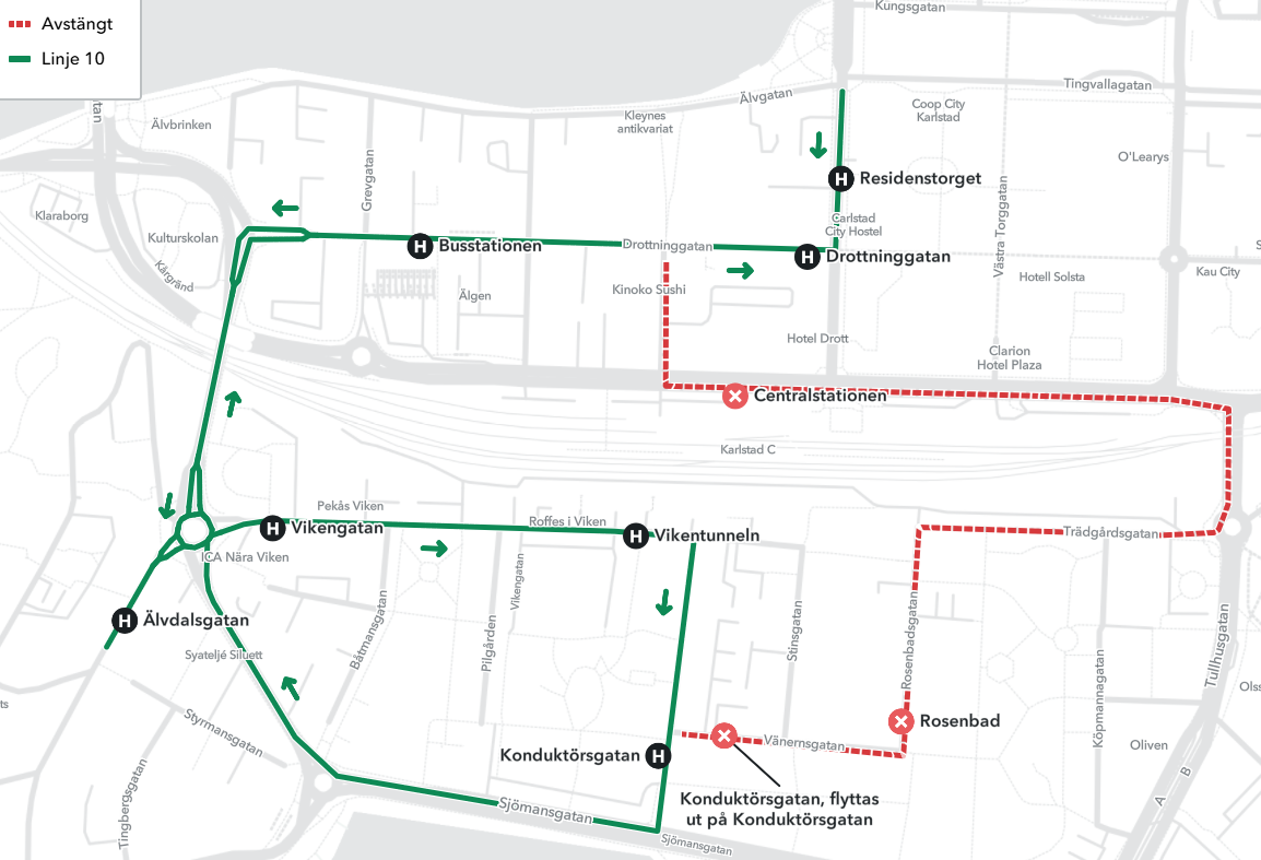 - Linje 10 stannar inte vid hållplatserna Vikentunneln eller Vikengatan.
