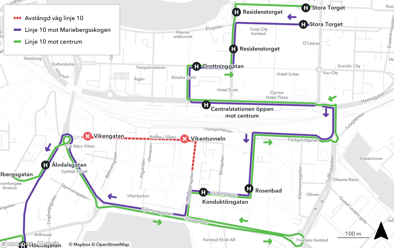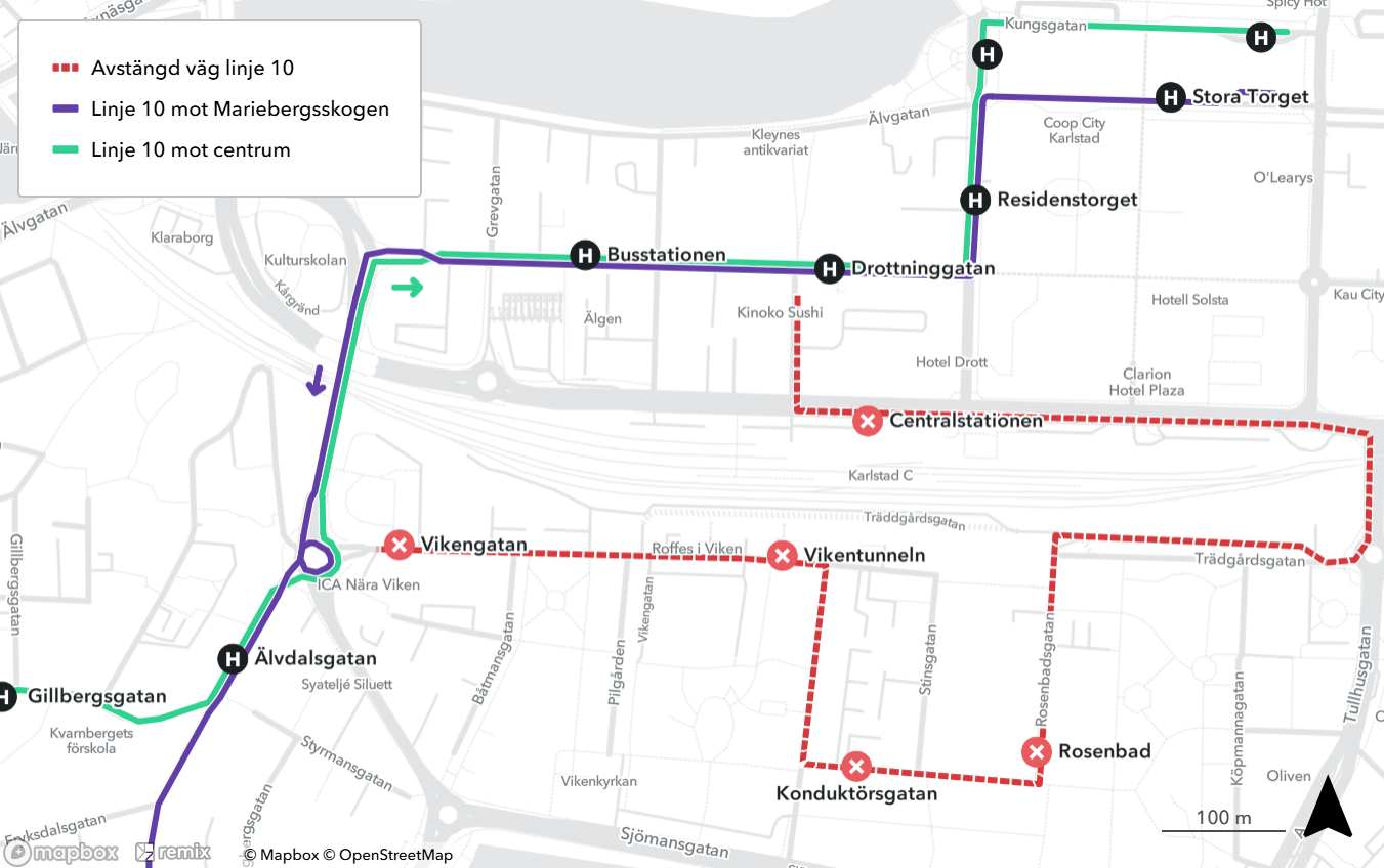 Linje 10 kör en omlagd körväg från Stora torget via Residenstorget, Drottninggatan och Busstationen till Älvdalsgatan i båda riktningar. Sedan ordinarie linjesträckning till och från Mariebergsskogen.