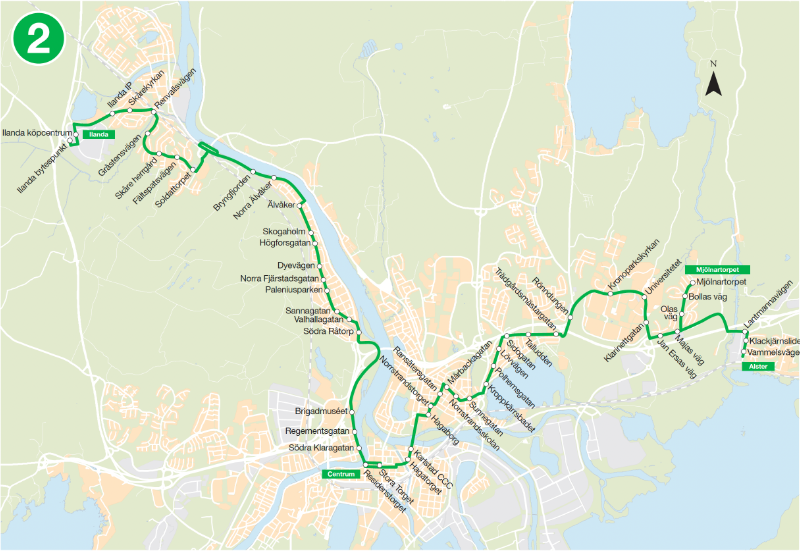 Linje 2. Alster/Mjölnartorpet – Kronoparken – Norrstrand – Centrum – Skåre – Ilanda