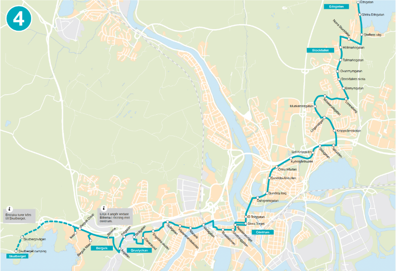 Linje 4. Edsgatan – Stockfallet – Lorensberg – Norra Kroppkärr – Centrum – Strand – Gruvlyckan – Bergvik