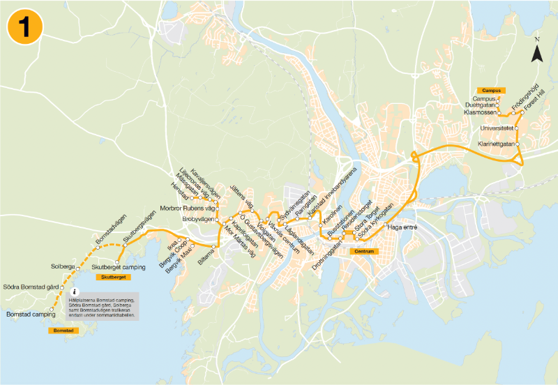 Linje 1. Campus – Universitetet – Centrum – Våxnäs – Henstad/Ikea – (Skutberget)