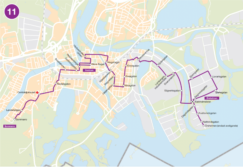 Linje 11. Örsholmen – Lamberget – Herrhagen – Centrum – Sjukhuset – Sommarro