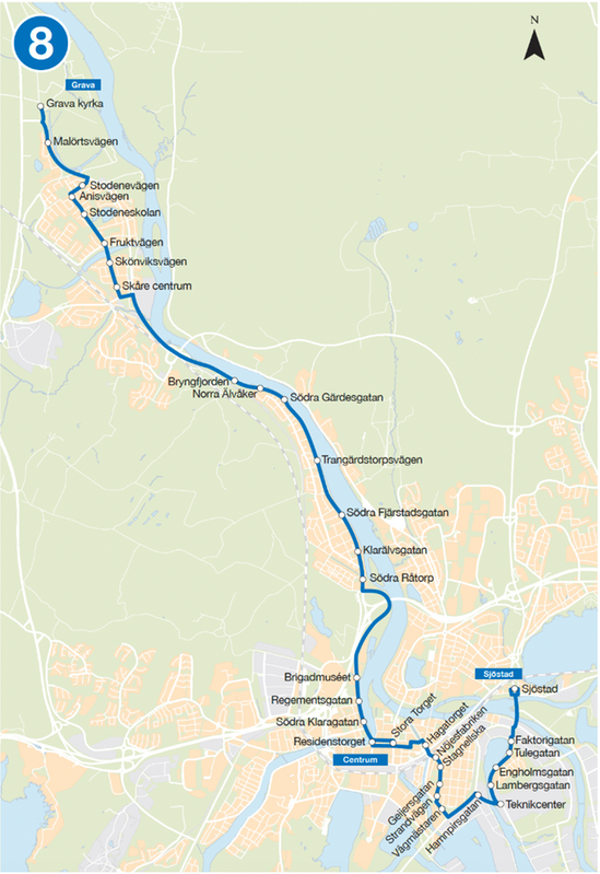 Linje 8. Sjöstad – Lamberget – Herrhagen – Centrum – Skåre – Grava