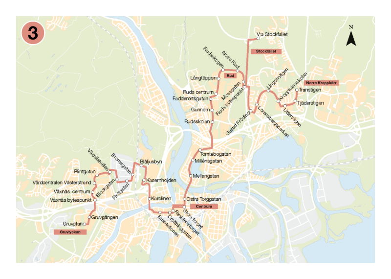 Linje 3. Västra Stockfallet/Norra Kroppkärr – Rud – Centrum – Våxnäs – Gruvlyckan