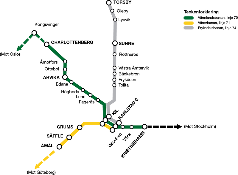71 | Karlstad - Kil - Grums - Säffle - Åmål - Göteborg | Linje 71 trafikeras av SJ och du kan köpa resor via Värmlandstrafik på sträckan Åmål-Karlstad. Aktuella trafikstörningar på sträckan Åmål-Karlstad hittar du på sj.se . | |